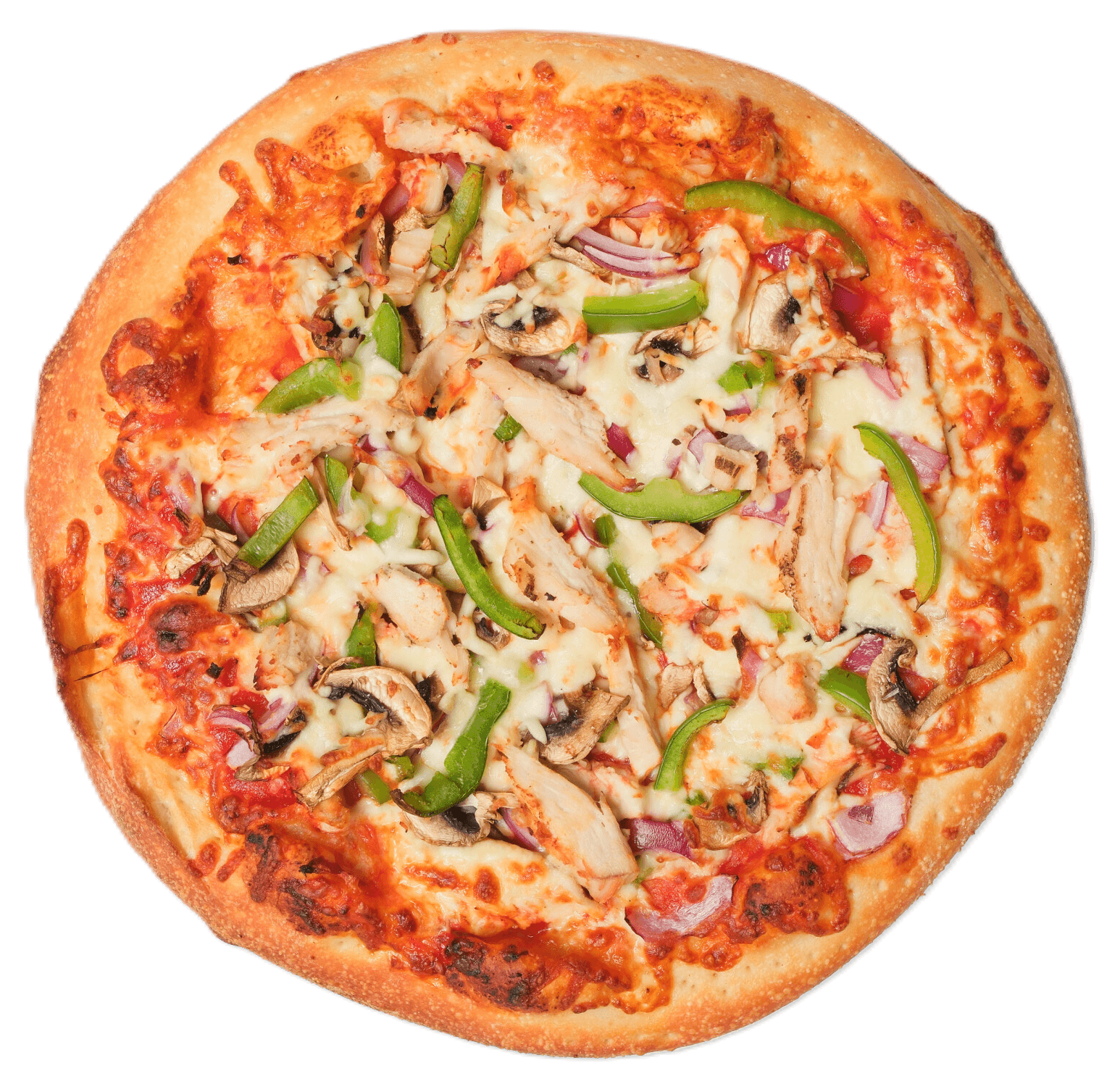 Calling all chicken enthusiasts! Our Chicken Lover Pizza is loaded with succulent grilled chicken, smoky bacon, and tender chicken slices, all smothered in rich tomato sauce and gooey mozzarella cheese. Every bite is packed with savory flavor and hearty goodness, making it the ultimate pizza for true chicken fans.