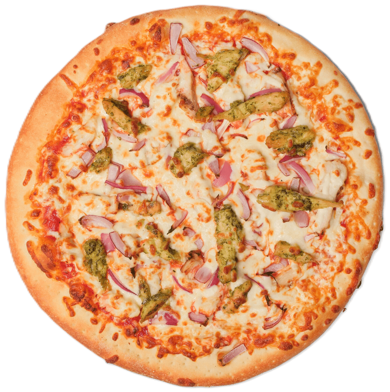 Indulge in a flavorful Italian classic with our Pesto Chicken Pizza! Featuring tender grilled chicken, fresh basil pesto sauce, and melted mozzarella cheese on a crispy golden crust. Topped with cherry tomatoes and a sprinkle of parmesan, this pizza offers a perfect balance of creamy, cheesy, and herby goodness.